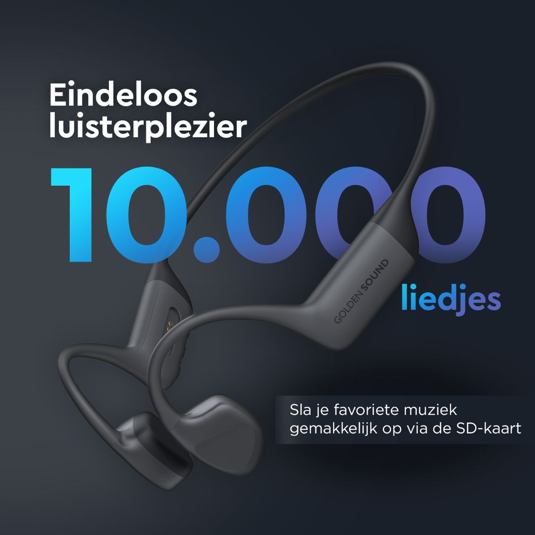 Na jarenlang onderzoek hebben wij de perfecte Bone Conduction oortjes ontwikkeld en gepatenteerd. Deze oordopjes zitten niet in je oor, maar op je jukbeenderen. Het geluid wordt via trillingen naar je oren gestuurd. Ze zijn waterproof, zitten heerlijk, én hebben 32GB opslag. Zo kun je muziek luisteren zonder je telefoon mee te hoeven nemen.